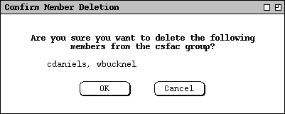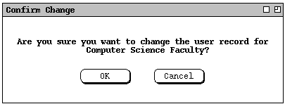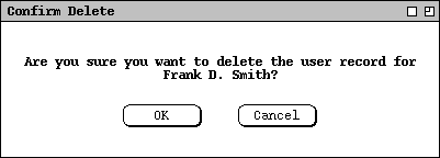 To delete a user, the administrator presses `Delete' in the user record display for the user to be deleted. In response, the system displays a confirmation dialog of the form shown in Figure 210.