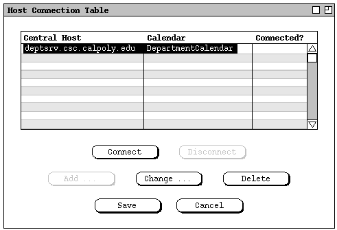 2. When an unconnected entry is selected, the `Change' and `Delete' buttons are enabled; `Add' and `Disconnect' are disabled; `Connect' is enabled if the selected host is not connected with another calendar in the table; `Cancel' is enabled.