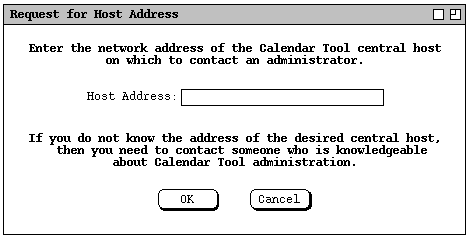 The user must enter a valid central host network address in order to proceed. In this context, a valid address is that of a network-accessible computer that is running a Calendar Tool central host server. If the user enters an invalid address, the system displays a failure dialog with the message "The entered host address is not valid.", in response to which the user can dismiss the failure dialog and re-enter a valid host address. There is no limit to the number of retries the user may perform.