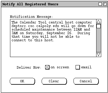 2. An administrator can send general notifications to all users with the `Notify Users' command; users receive these notifications in on-screen dialogs, email messages, or both (see Section 2.6.5.4 ).