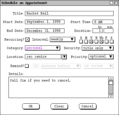 The user has set the priority for the new appointment to `optional' instead of `must'. The operative effect of selecting `optional' priority relates to scheduling meetings, which is discussed further in Section 2.4.1. Aside from meeting scheduling, the meaning of `must' versus `optional' is purely informational, i.e., it indicates the relative importance of the appointment.