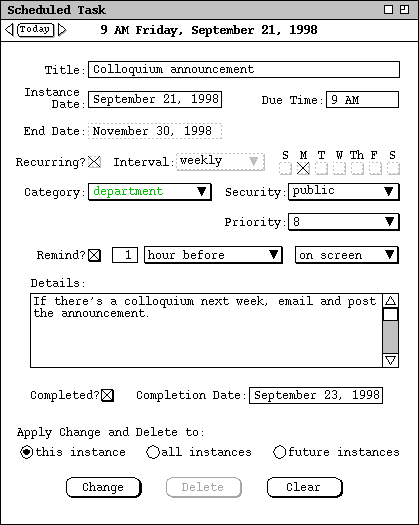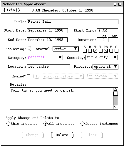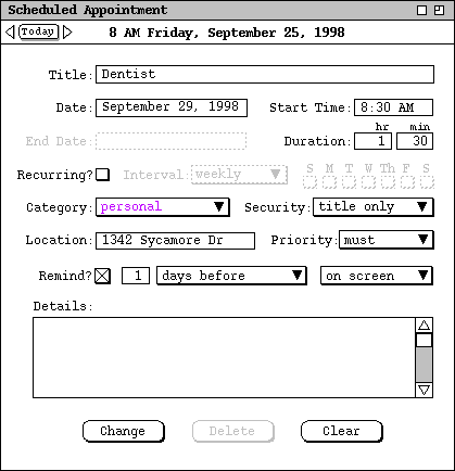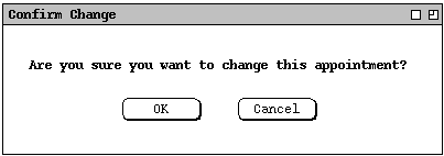 All data fields may be edited in the item-level view of an appointment, with a few restrictions. The same data-entry rules apply when changing an appointment as when initially scheduling it. These rules are covered in detail in Section . In addition to these data-entry rules, there are the following restrictions on changing a recurring appointment: