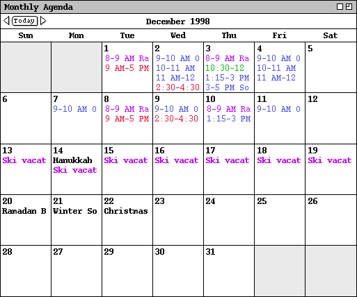 The user may select calendar items for deletion in any daily, weekly, or monthly view. To do so, the user selects the item(s) to be deleted, and then presses the `delete' key. To select more than one item, the user clicks on successive items while holding down the shift key. Complete details of item selection are covered in Section .