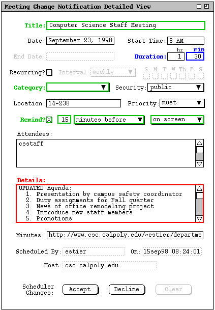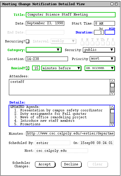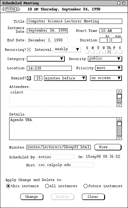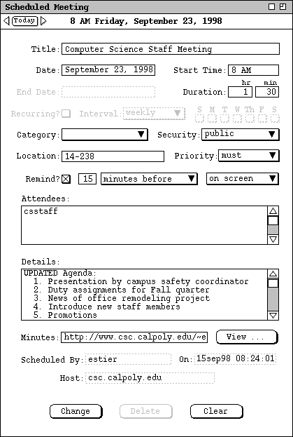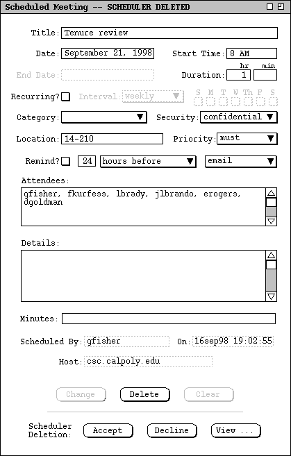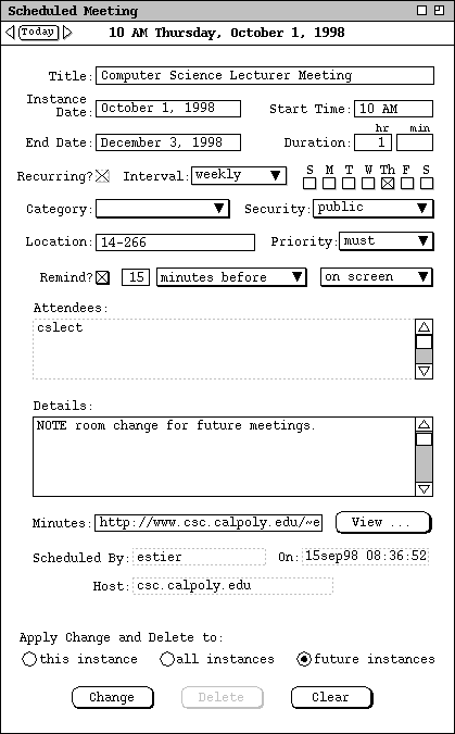 Individual users can also change their own local copies of scheduled meetings. When both schedulers and non-schedulers make changes to the same meeting, their changes must be reconciled. What it means to have separate copies of the "same meeting" is that values of the `Scheduled By', `On', and `Host' fields are the same in each of the copies. The set of values for these three fields constitutes the unique identification of a meeting on all users' calendars. This is the reason why these values cannot be changed after a meeting has been scheduled.