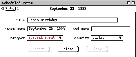 When the user confirms an event change or delete, the user's calendar and active display windows are updated accordingly. Change of a multi-day event affects all of its days. Deletion of a multi-day event deletes all of its days. The effect of deleting one or more days of a multi-day event is achieved by changing the start or end date values. The start and end dates of a multi- day event always represent a contiguous range of days. Hence, the system provides no means to delete one or more middle days of an event, between but not including a start or end date.