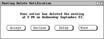 Depending on the state of an attendee's connection to a central host, it is possible for a scheduler to send one or more change/delete notifications before an attending user accepts or declines any of them. The system retains only a single change/delete notification for any given meeting. The retained notification corresponds to the most recently confirmed change or delete executed by the meeting's scheduler. To be clear, there is a single notification for any particular meeting, corresponding to the most recent change or delete operation. There is not a separate notification for change and for delete. By the nature of the delete operation, once confirmed it is be the last notification produced by the scheduler. Hence, once a delete notification is sent, no further notifications will follow. The definition of a "particular meeting" is based on the unique identification provided by its `Scheduled By', `On', and `Host' values.