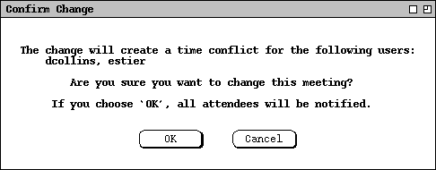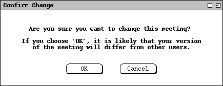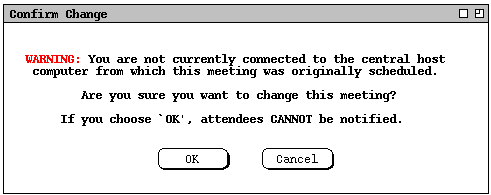 A conflicting meeting change occurs when a non-scheduling user changes a meeting field that has also been changed by the scheduler, before the scheduler change notification has been received. As discussed in the preceding scenarios, the Calendar Tool system is designed to avoid conflicting meeting changes insofar as is possible. As long as a non-scheduling user remains up to date with scheduler change notifications, the system prohibits conflicting changes. The user can accomplish this up-to-datedness by retaining or establishing a central host connection any time prior to editing a scheduled meeting, and by not setting the meeting notification option to `never'.