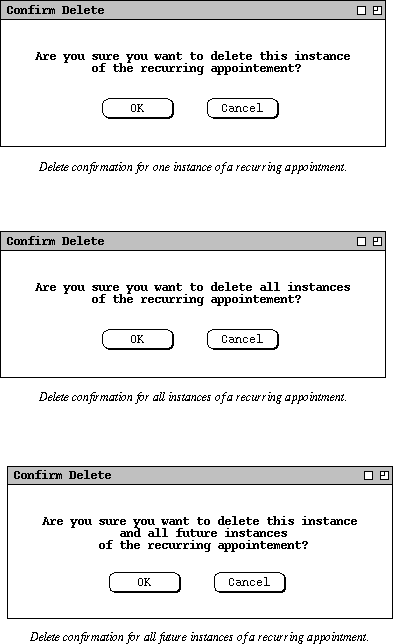 Figure 156: Delete confirmation dialogs for a recurring appointment.