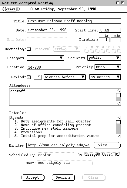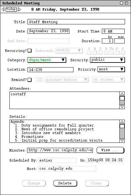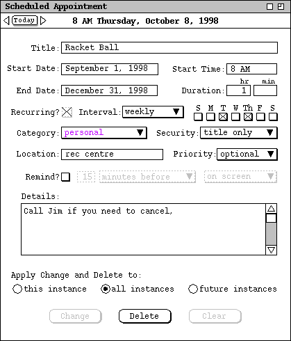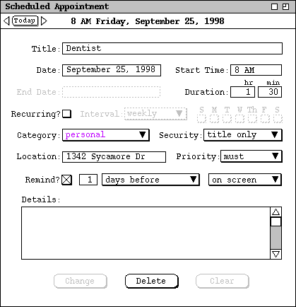 At the far left of the time/date header are the Previous/Today/Next buttons, as described above for the appointment item. The `Change', `Delete', and `Clear' buttons provide editing functionality, as covered in Sections and 2.5.2.2.5.