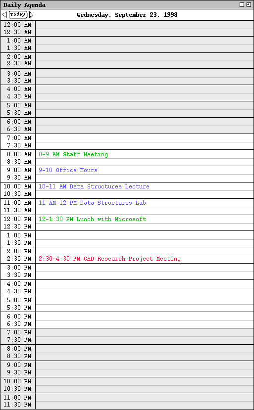 In Figure 13, the user is viewing the details of Wednesday, September 23, which is today's date in this scenario. The items shown in Figure 13 reflect a number of scheduling commands having been performed by the user, subsequent to the commands illustrated in the scenario of Section 2.2. In particular, the user has scheduled some typical items such as meetings, lunch dates, and class lectures.