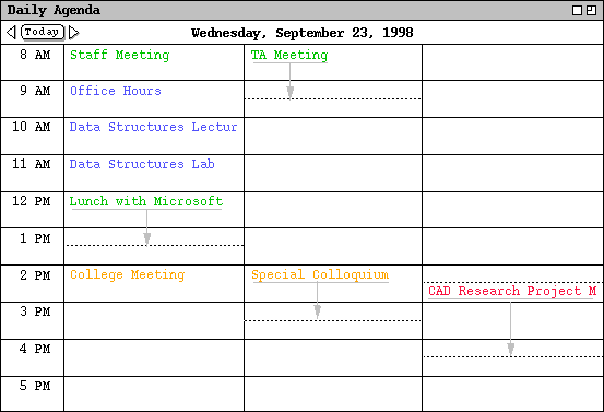 4. When an item ends in an hour after the hour in which it begins, a down-pointing arrow is drawn to the ending time. This case is also illustrated by the "CAD Research Project Meeting".