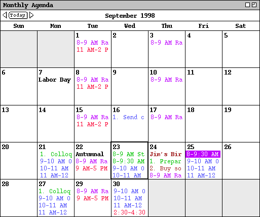 An example of the month view was shown originally in the initial screen configuration ( Figure 1 ), since the month view is the standard default. It is chosen explicitly with the `Month' command from the `View' menu. Figure 21 shows the result of the user making this selection for the month of September 1998.