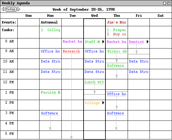 After the day view, the next larger-grain level of viewing is a week. There are two choices for the format of the week view: table and lists. These choices are available on a submenu when the user chooses the `Week' command from the `View' menu. When the user chooses the table-style week view, the screen appears as shown in Figure 18.