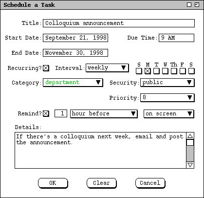 The date and time fields of a task specify when the task is due. A task has no specific start time or duration. The `End Date' field applies to recurring tasks; it is initially disabled since the default for tasks is non- recurring. The `Security' for a task is one of two levels: `Public' or `Private'. The `TitleOnly' and `Confidential' security levels do not apply to tasks, since these levels are only meaningful for scheduled items that have a start time and duration, i.e., appointments and meetings.