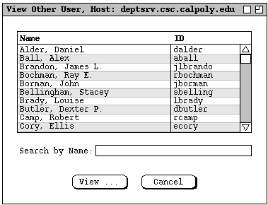 To select a user for viewing, the current user clicks on the name or ID in any row of the display. The `Search by' field allows the current user to type a name or ID to be searched for. As characters are typed, the list scrolls to the earliest listed name or ID with a leading prefix that matches the typed characters. Whether the search is by name or ID is based on the selected sorting order. When the list is sorted by the `Name' field, the search field is labeled "Search by name". The search field is labeled "Search by ID" when the list is sorted by `ID'. The current user can enter a regular expression in the search field. Details of regular expression search and syntax are covered in Section .